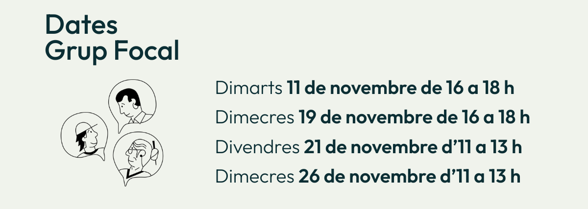 El Grup Focal té per objectiu recollir les diferents opinions i sentirs de les participants en relació al tema de la sòcia de treball, i es farà a través d’una conversa pautada. Hi ha quatre dates disponibles, cadascú pot escollir la que li vagi millor: