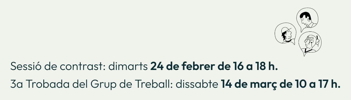 La primera constarà d’una sessió virtual amb les participants del Grup Focal de l’inici del procés. Aquesta sessió servirà per contrastar la feina que ha desplegat el Grup de Treball fins al moment.