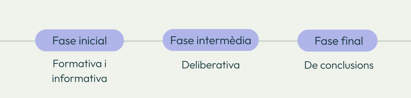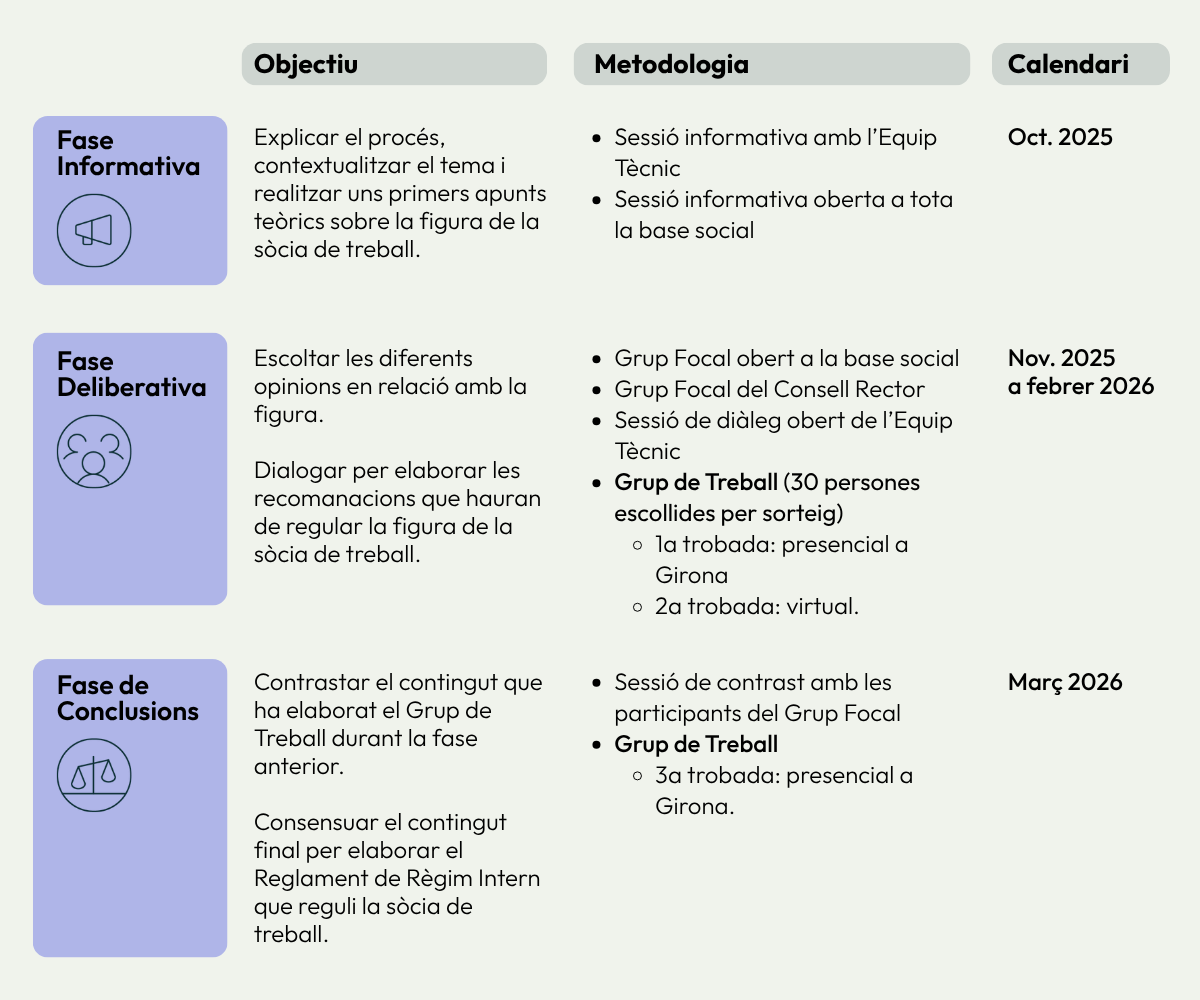 Aquest procés compta amb diferents fases: la fase inicial (informativa), la intermèdia (deliberativa) i la final (de conclusions). En cadascuna d’aquestes fases hi intervenen els diferents òrgans de la cooperativa i s’hi treballa diferent informació.