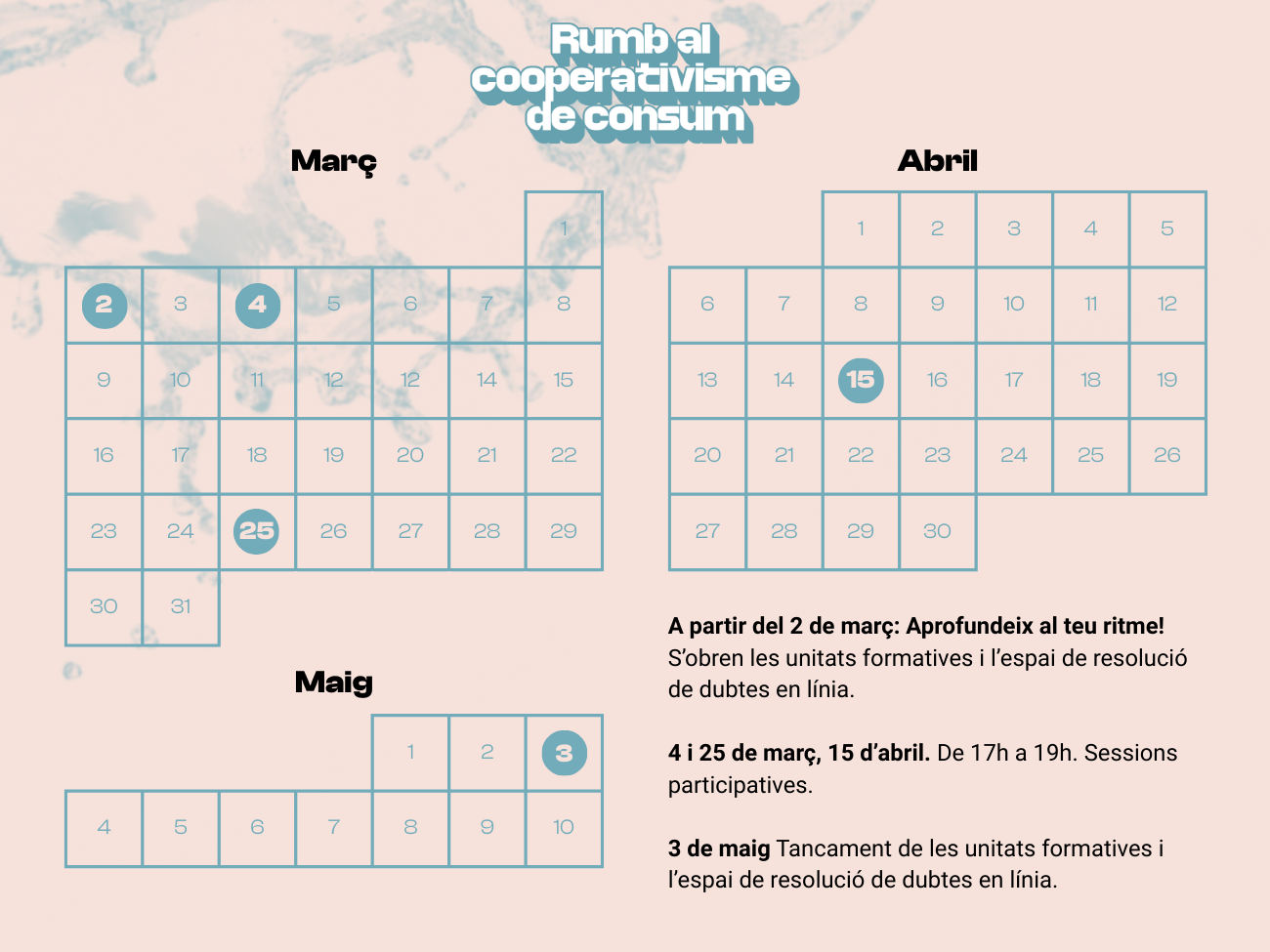 La formació s'iniciarà oficialment el 2 de març amb l'obertura de l'espai virtual i finalitzarà el 3 de maig. Les sessions en directe tindran lloc de 17 h a 19 h els següents dies: