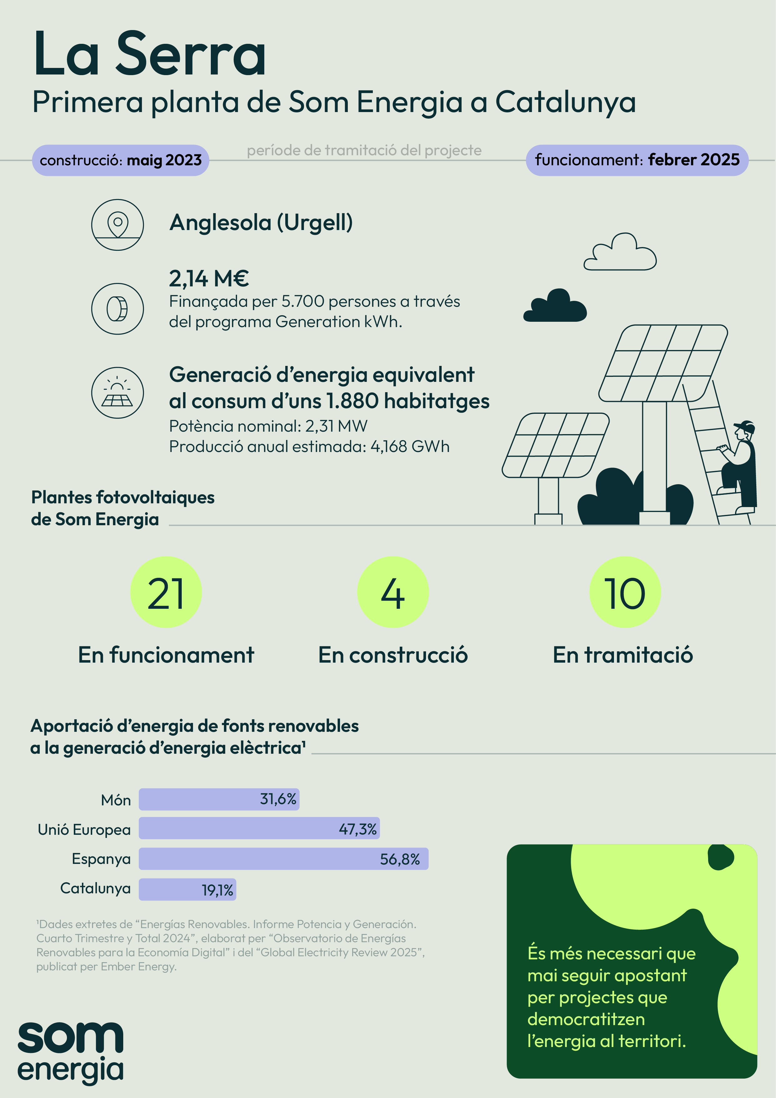 La posada en marxa del projecte, que es va allargar des des de maig de 2023 a febrer de 2025, demostra la importància de replantejar com produïm i consumim electricitat i la necessitat que les empreses i organismes competents agilitzin la tramitació de projectes d’energia renovable. Som Energia està compromesa a reduir al màxim la dependència del mercat energètic convencional i construir un sistema més eficient, just i transparent. Per fer-ho possible, cal apostar per la generació d’electricitat a escala petita i local, amb infraestructures arrelades al territori i adaptades a les necessitats reals de la població.