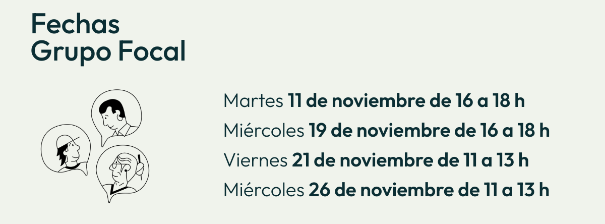 El Grupo Focal tiene por objetivo recoger las diferentes opiniones y sentimientos de las participantes en relación al tema de la socia de trabajo, y se realizará a través de una conversación pautada. Hay cuatro fechas disponibles, cada cuál puede escoger la que mejor le vaya: