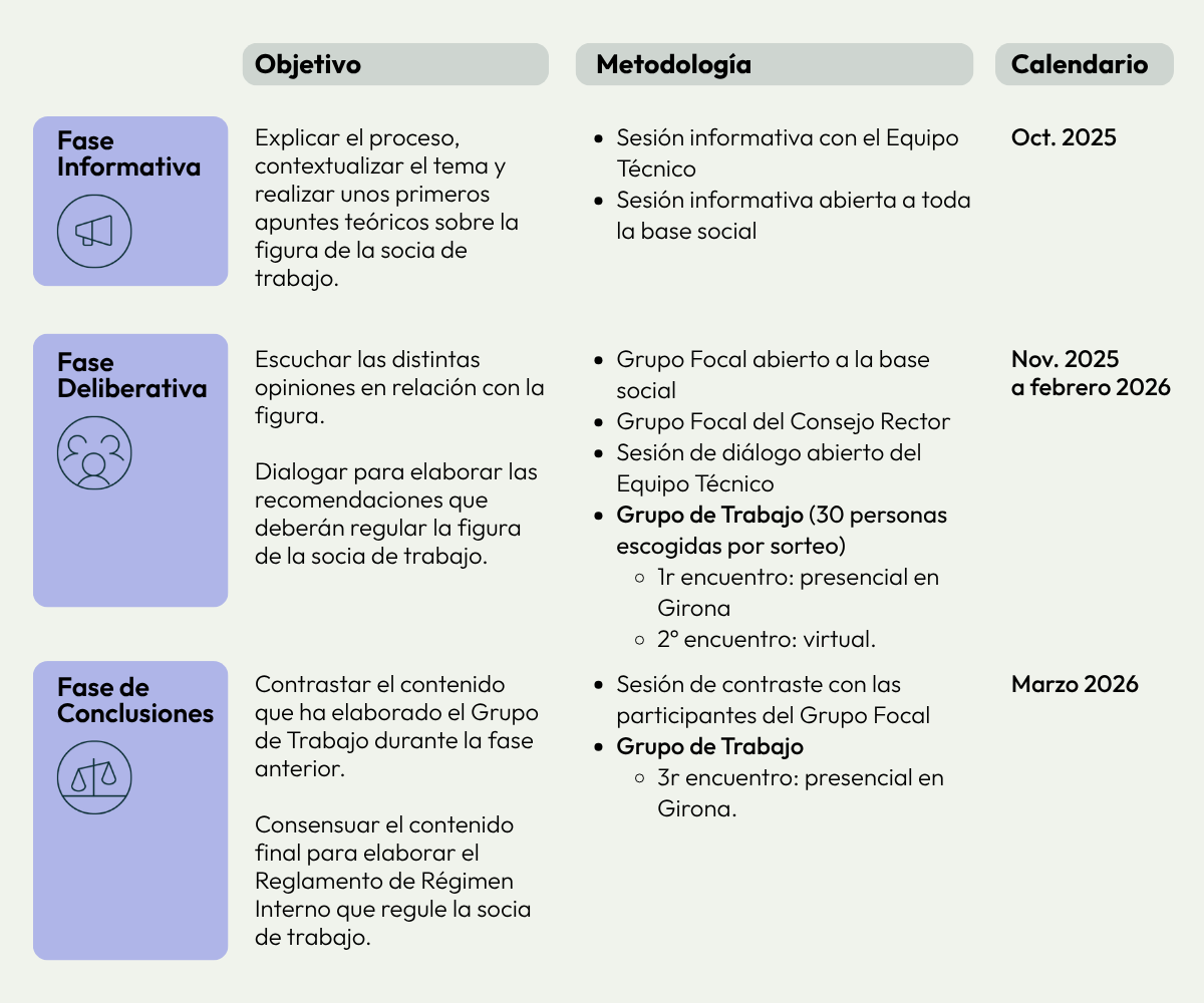 Este proceso cuenta con distintas fases: la fase inicial (informativa), la intermedia (deliberativa) y la final (de conclusiones). En cada una de estas fases intervienen los diferentes órganos de la cooperativa y se trabaja diferente información.