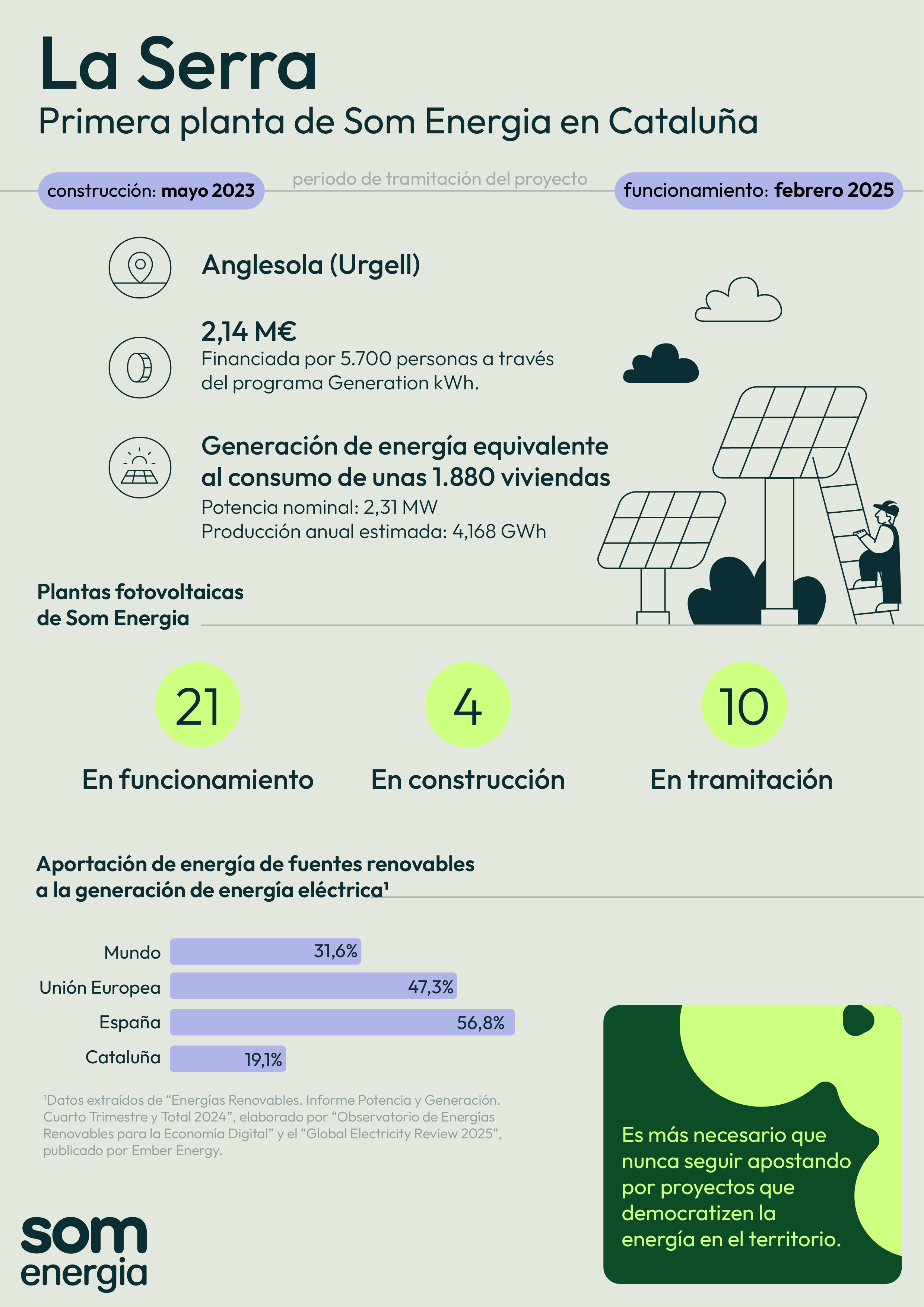 Con una potencia nominal de 2,31 MW, la planta genera anualmente unos 4,168 GWh, una producción eléctrica que equivale al consumo aproximado de 1.880 hogares. Esta nueva infraestructura eleva a 21 el número total de instalaciones de generación renovable que Som Energia tiene actualmente en funcionamiento en todo el Estado. Con este proyecto, la cooperativa continúa consolidando su modelo energético basado en la sostenibilidad, la participación ciudadana y la soberanía energética.
